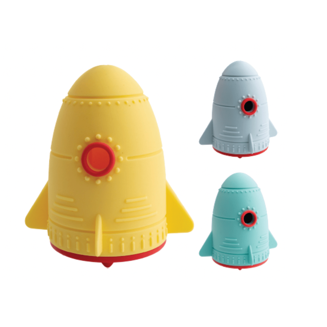 Rocket-Inspired Design: Bright colors and playful shape attract dogs.